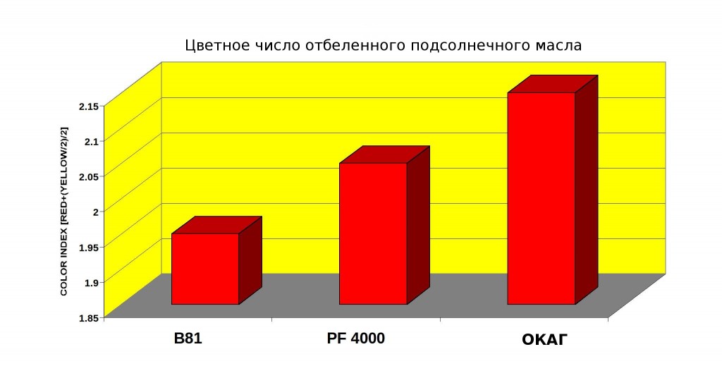 Перечисленные достоинства наших отбельных земель демонстрируются в лабораторных экспериментах с различными растительными маслами. Необходимо заметить, что в лабораторных экспериментах величина добавки отбеливающего адсорбента выше, чем в реальном производственном процессе. Результаты лабораторного отбеливания могут использоваться только для сопоставления различных отбеливающих глин между собой.